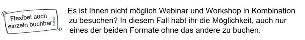 Diese Weiterbildung gehört zur Angebotsreihe Web & Work – dieses Weiterbildungsangebot soll die Leichtfüßigkeit des digitalen Austausches mit der Individualität und Interaktivität der Präsenzveranstaltung kombinieren. Zu ausgewählten Themen bietet ein Webinar die Basisinformationen und theoretischen Grundlagen. Ein Samstags-Workshop einige Wochen Austausch, Ausprobieren und Reflexion in der Gruppe. Der Fokus im Workshop liegt darauf, die Inhalte und Methoden anzuwenden und für die eigene Arbeitssituation zu adaptieren.