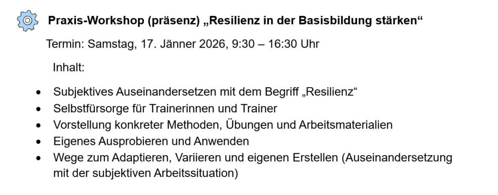 Resilienz als innere Stabilität und psychische Abwehrkraft kann ein Individuum und auch Gruppen im Umgang mit inneren und äußeren Stressoren stärken und so Resistenz, Regeneration und Rekonfiguration ermöglichen. Das Thema Basisbildungsbedarf bei Erwachsenen ist konfrontiert mit zu wenig öffentlichem Selbstverständnis. Tabuisierung, Stigmatisierung, Ausgrenzung, Stress und Scham prägen häufig den Alltag betroffener Personen. Das durch Resilienzen ermöglichte Erkennen und Einsetzen von Fähigkeiten, Ressourcen und Kompetenzen in schwierigen Situationen unterstützt Erwachsene bei der positiven Gestaltung ihres Bildungsprozesses.